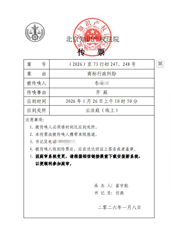 法院认为两案为关联案件,同一原告、同一被告、同一争议商标标志,均因商标驳回复审引发,同步进入行政诉讼程序,合并安排庭审,此案【案号:(2026) 京 73 行初 247、248 号】于 2026 年 1 月 26 日在云法庭线上开庭。